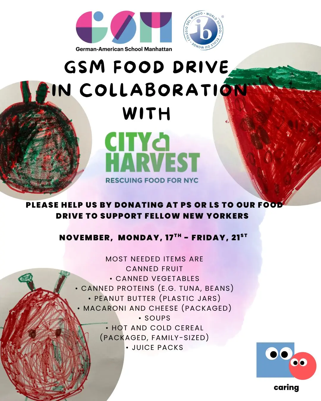 We are caring at GSM! It’s that time of the year again when we come together as a community to help others! Our GSM City Harvest Food Drive will take place from November 17-21. Please consider donating food items (see the flyer) – every contribution helps families in need across New York City.
